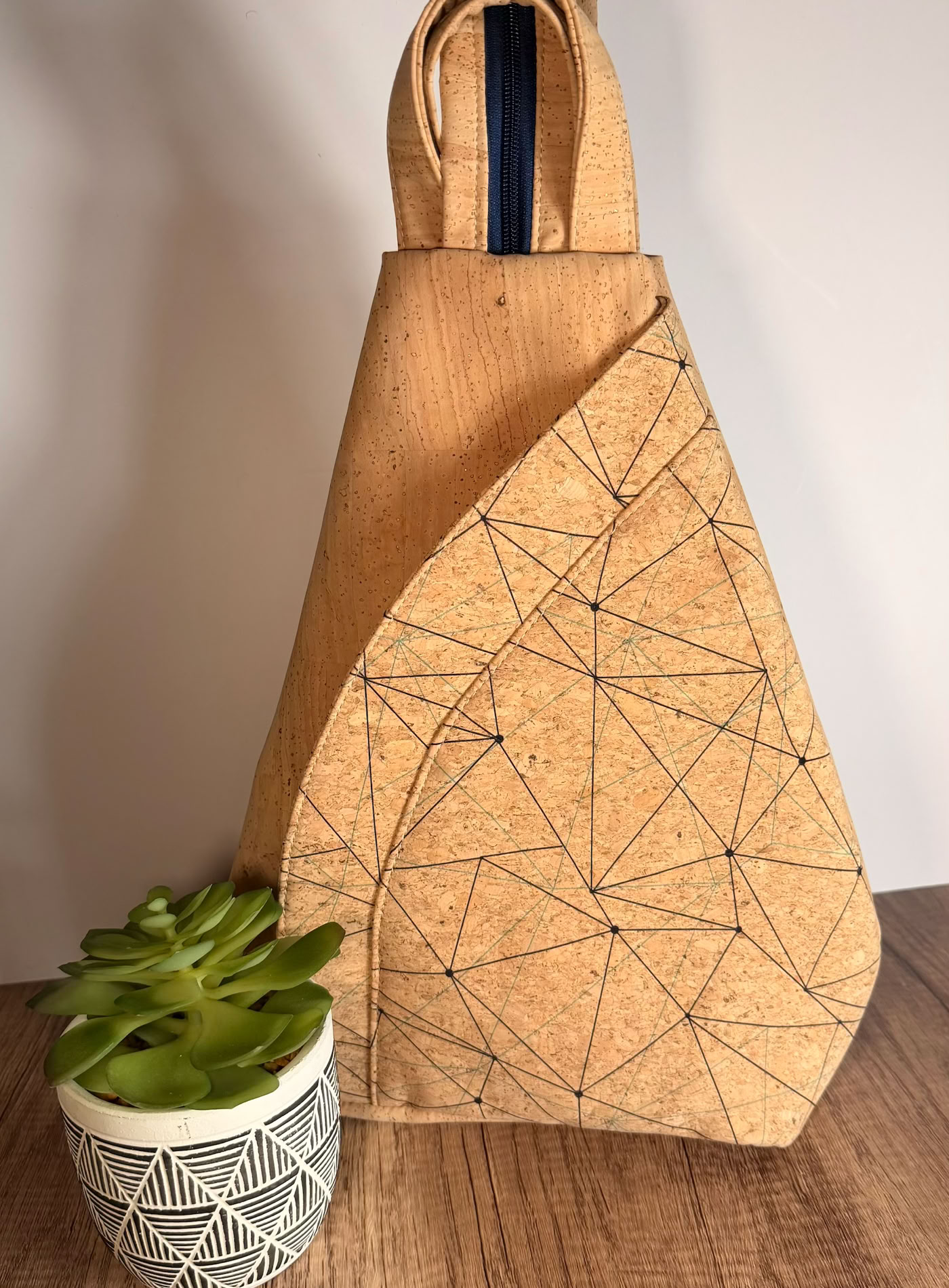 Dieses einzigartige Accessoire besticht durch sein modernes, geometrisches Design und den innovativen Einsatz von hochwertigem Korkmaterial. Die formschöne Silhouette sorgt nicht nur für Komfort, sondern auch für ein besonderes Highlight in Ihrem Look.